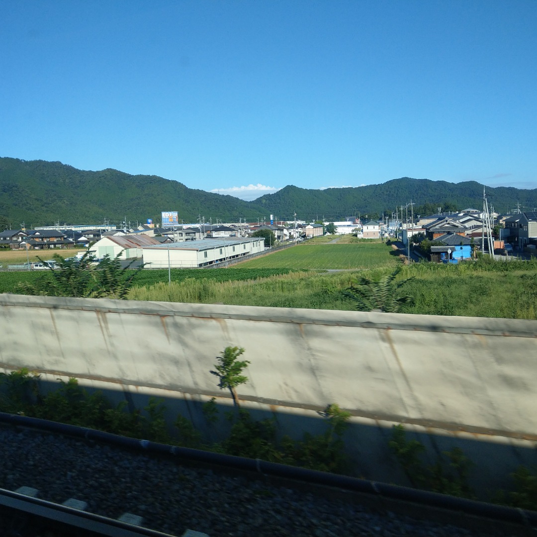 チラリとですが写真奥に琵琶湖が...東海道本線からは見えない琵琶湖ですが、新幹線はやはり高い所を走ってるんですねぇ...